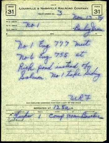 The Story on this order is that one of the trains was running late, and the dispatcher has ordered the trains to meet at a different location. In which a "31Order" would be required. Normally the trains would have meet at Salmon with #1 taking the siding. A "31 Order" is mandatory in this situation because the train crews of the opposing trains had to know exactly how to handle the meet; also the order could'nt be "hooped-up" ,the trains recieving the order had to stop and the Conductor & the Engineer sign for the order, with the Conductor signing first.