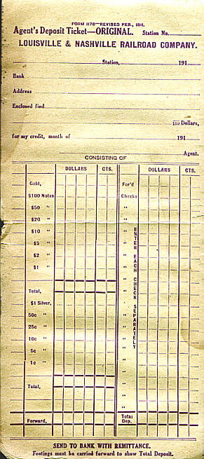 L&N RR. Ticket Agent Bank Deposit Ticket