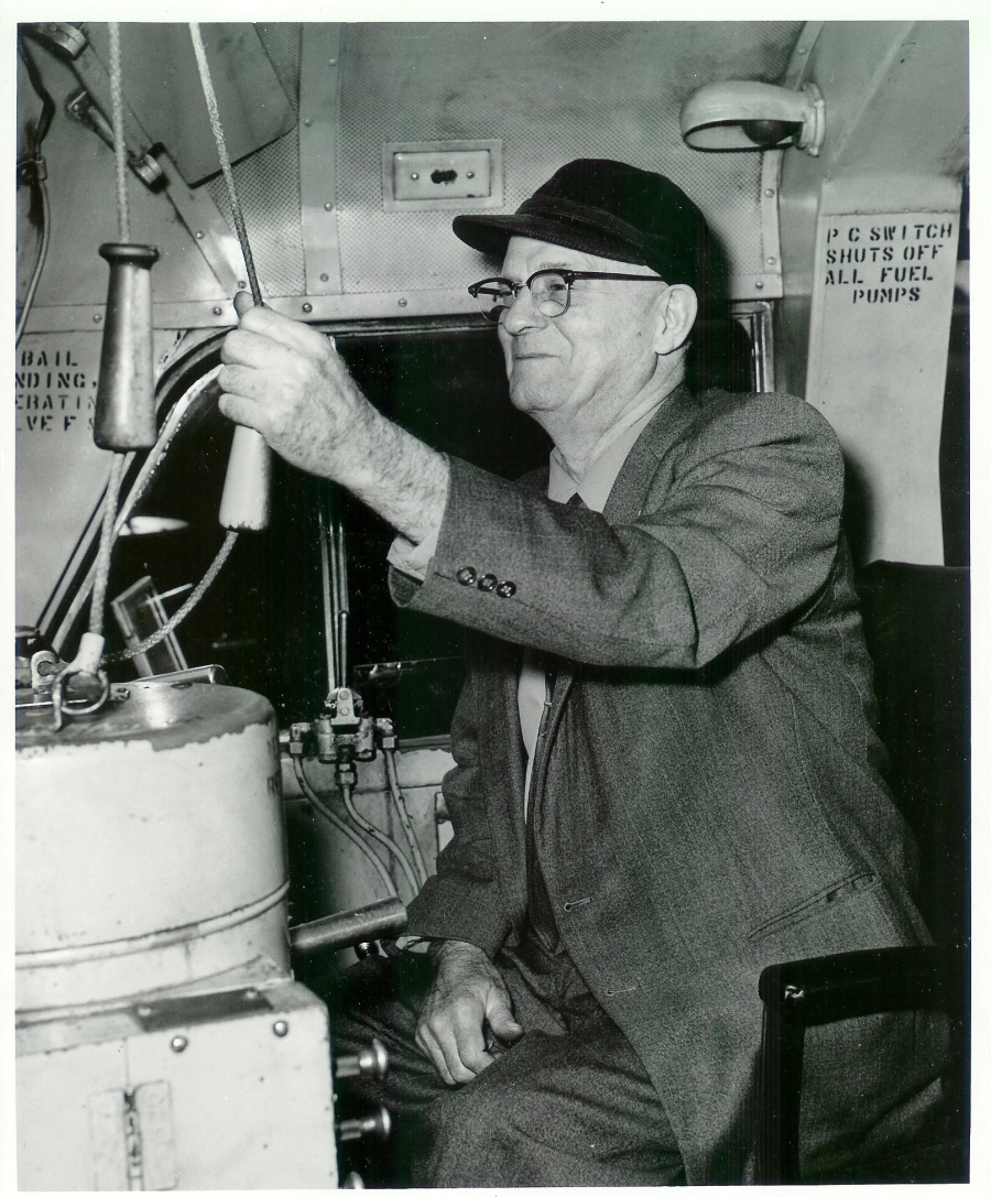 Malory, G.W. Jose, C.J. Lynch. L-R in cab of engine; A.L. Williams and C.A.